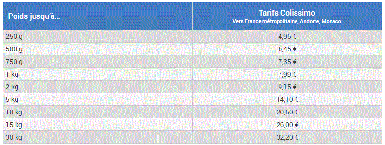 Voici pour information les tarifs d’expédition Colissimo de La Poste :