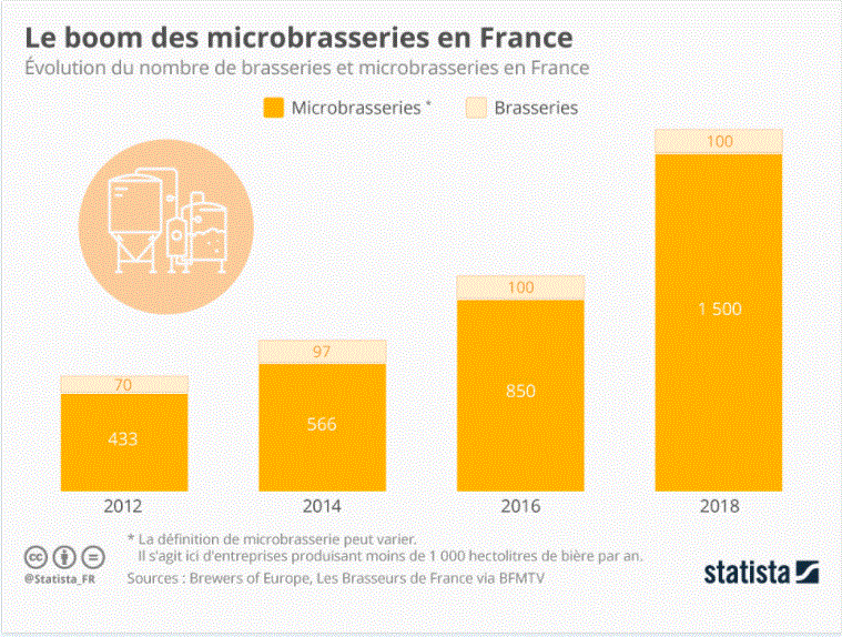 Le nombre de microbrasseries explose partout dans le monde. Voici l’évolution constatée en France ces dernières années. En 2020, on dénombre même environ 2000 microbrasseries dans l’hexagone ce qui représente une création d’entreprise tous les 2 jours sur les 5 dernières années tandis que le nombre de brasserie traditionnelle stagne :