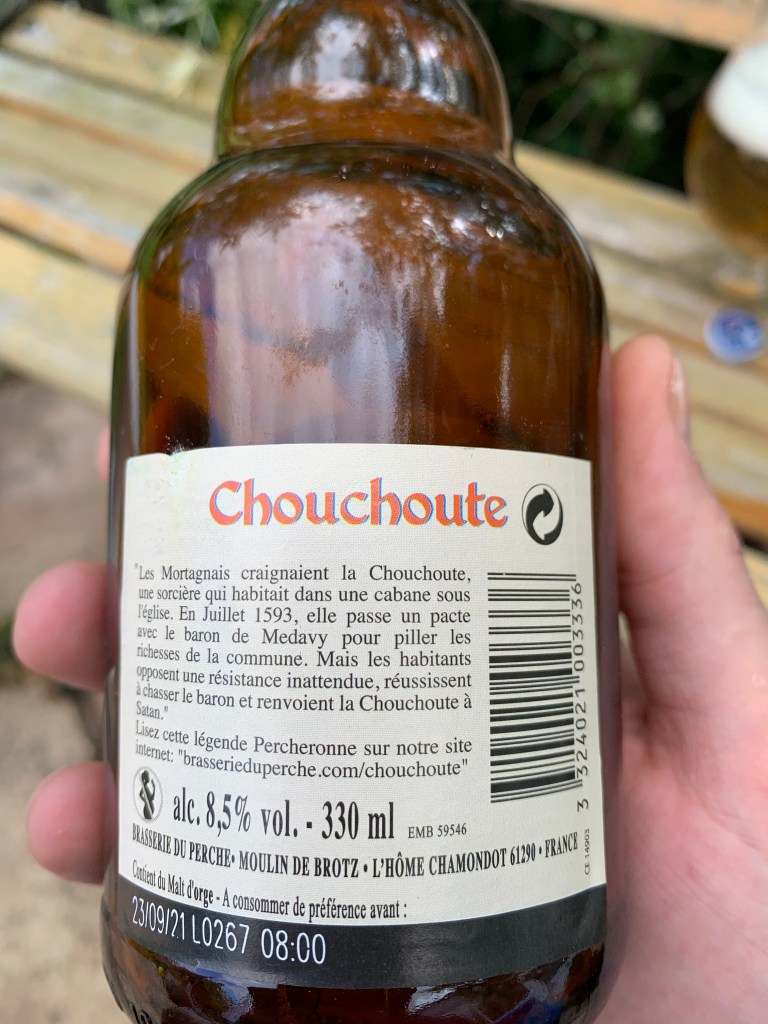12/20 – La Chouchoute est une bière blonde triple qui ne dit pas son nom. La liste des ingrédients ne figure pas plus sur l’étiquette que son appellation. A la place des informations techniques conventionnelles sur le contenu de la bouteille la brasserie du Perche nous plonge dans une vraie histoire locale de sorcière (Mortagne dans l’Orne, 61)!